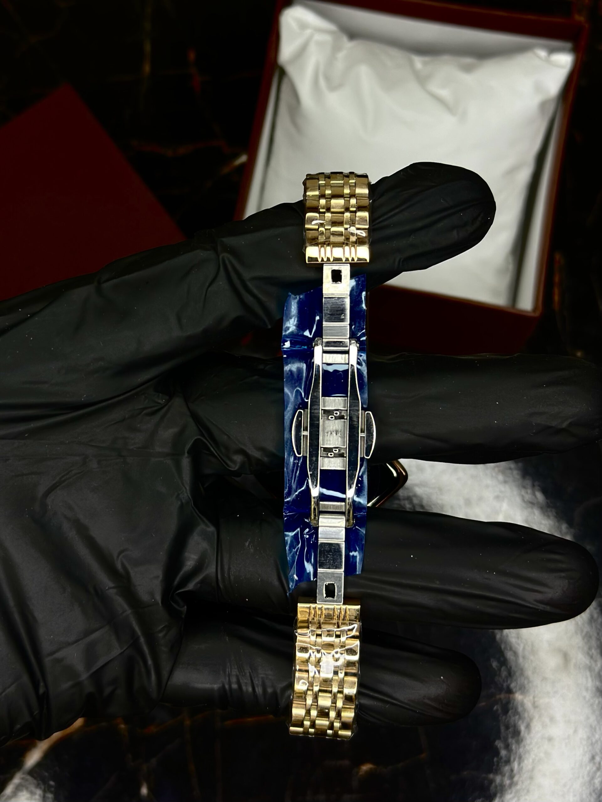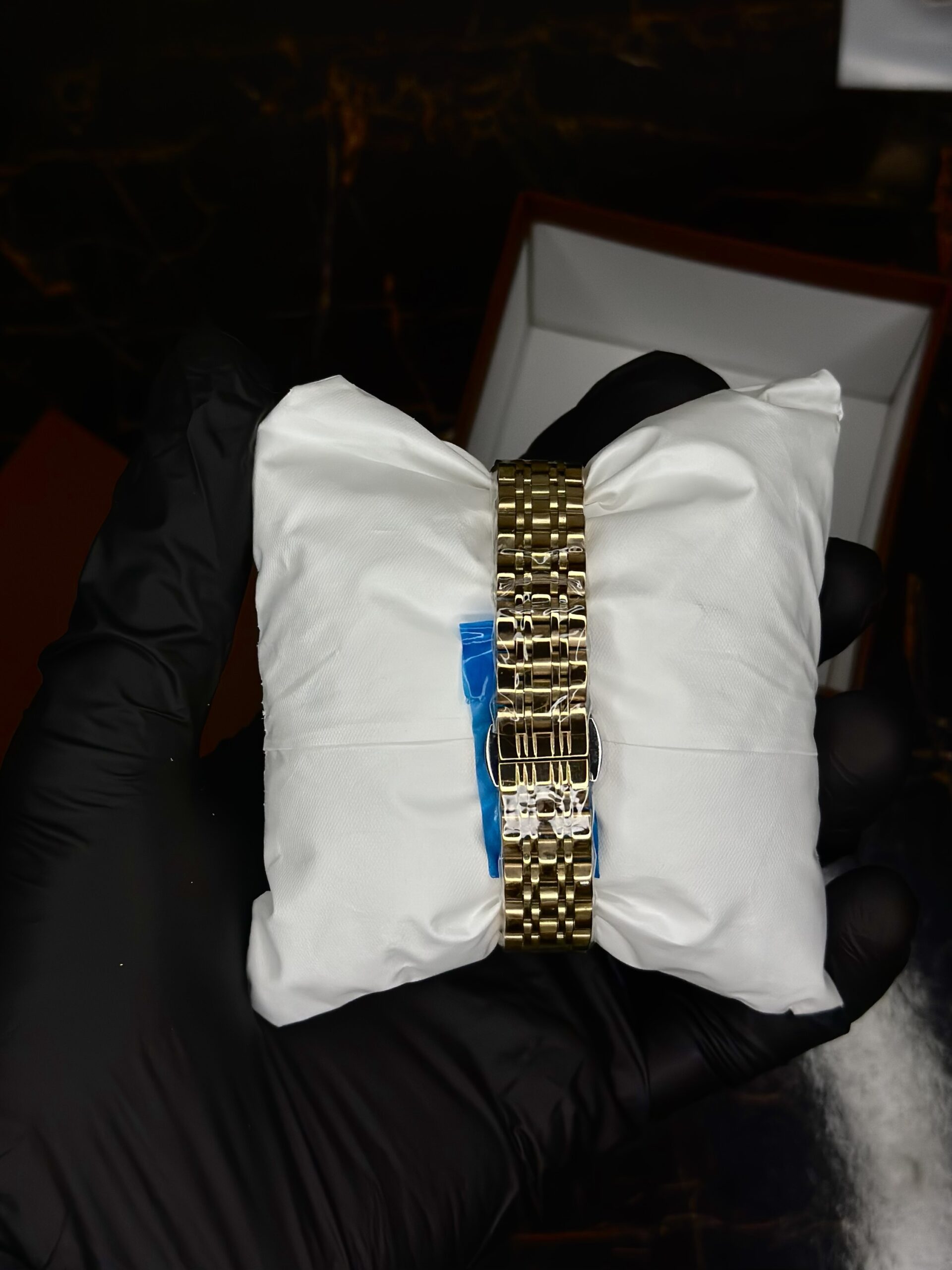 A bold square-rotated timepiece with a striking emerald green dial, golden accents, and a polished link bracelet, blending elegance with modern geometry.