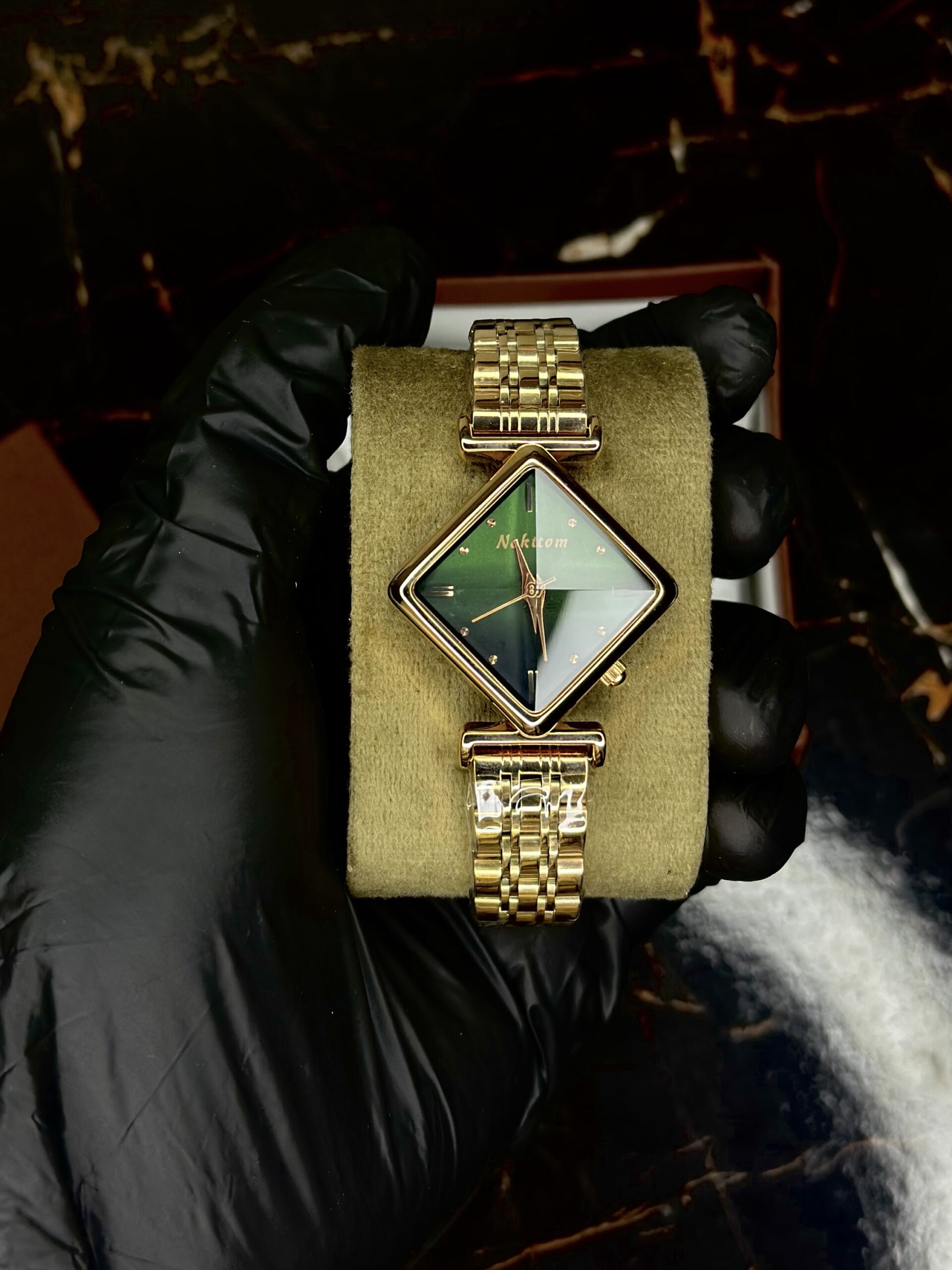 The NEKTOM Emerald Prism is a statement of refined artistry and modern sophistication. Featuring a unique diamond-shaped case orientation, it showcases a deep emerald green dial that shifts beautifully under light, complemented by minimalist golden hour markers and slender hands. The luxurious gold-toned bracelet with intricate links enhances its premium appeal, making it a perfect choice for both formal evenings and stylish everyday wear. Designed to stand out, this timepiece captures the essence of individuality and elegance in every detail.