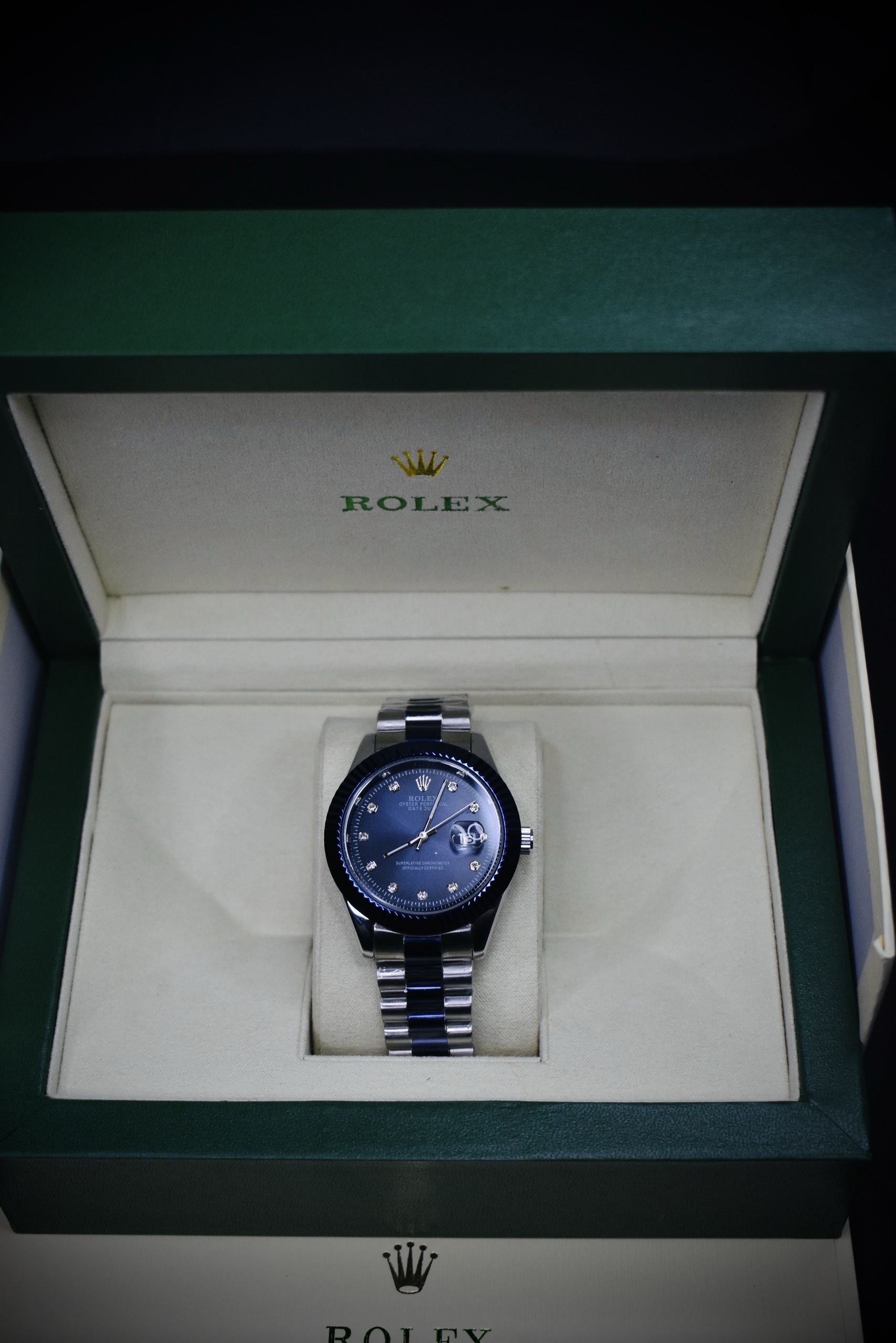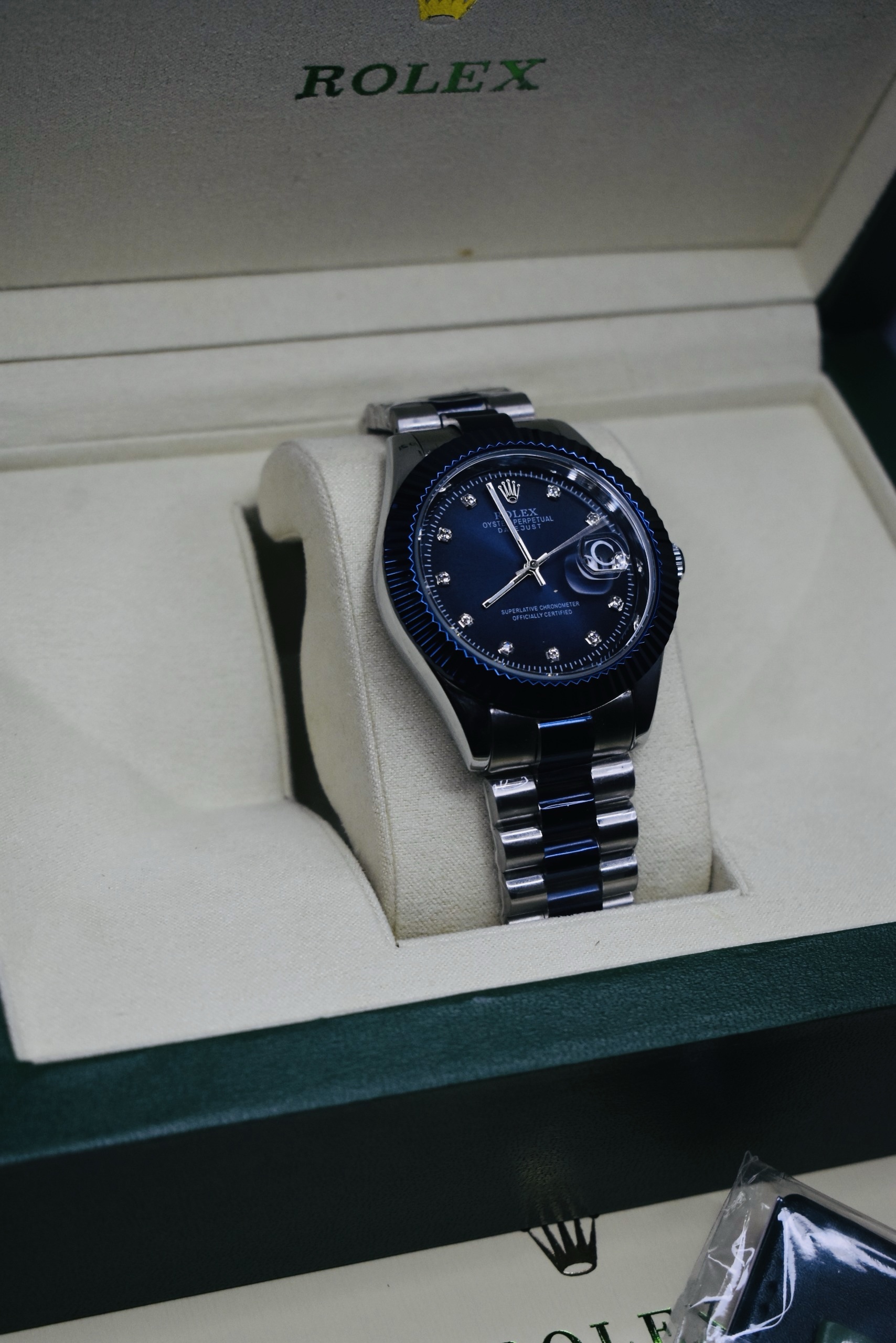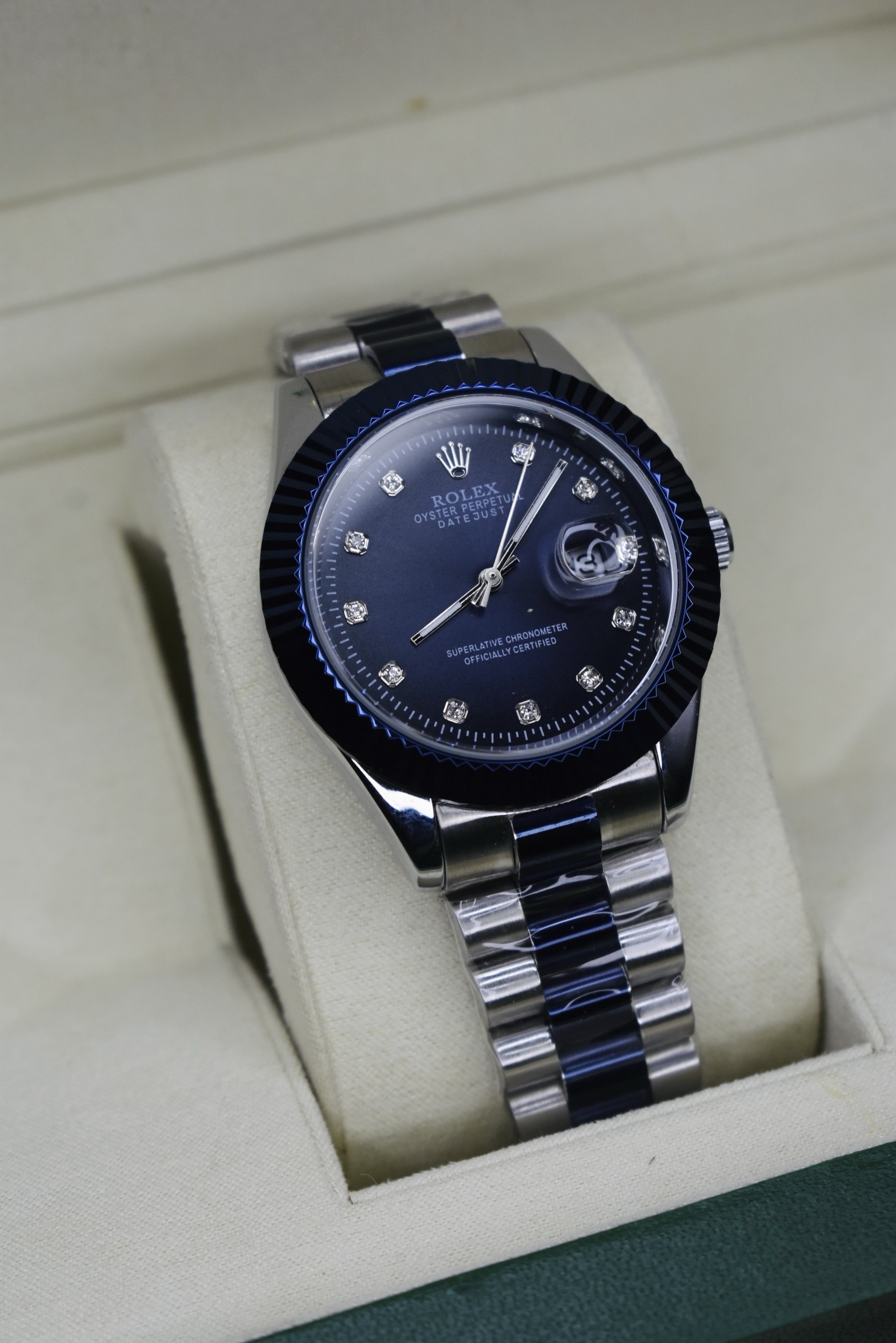 Rolex Blueline – a sleek Blue dial watch with diamond hour markers, showcasing bold elegance and timeless style.