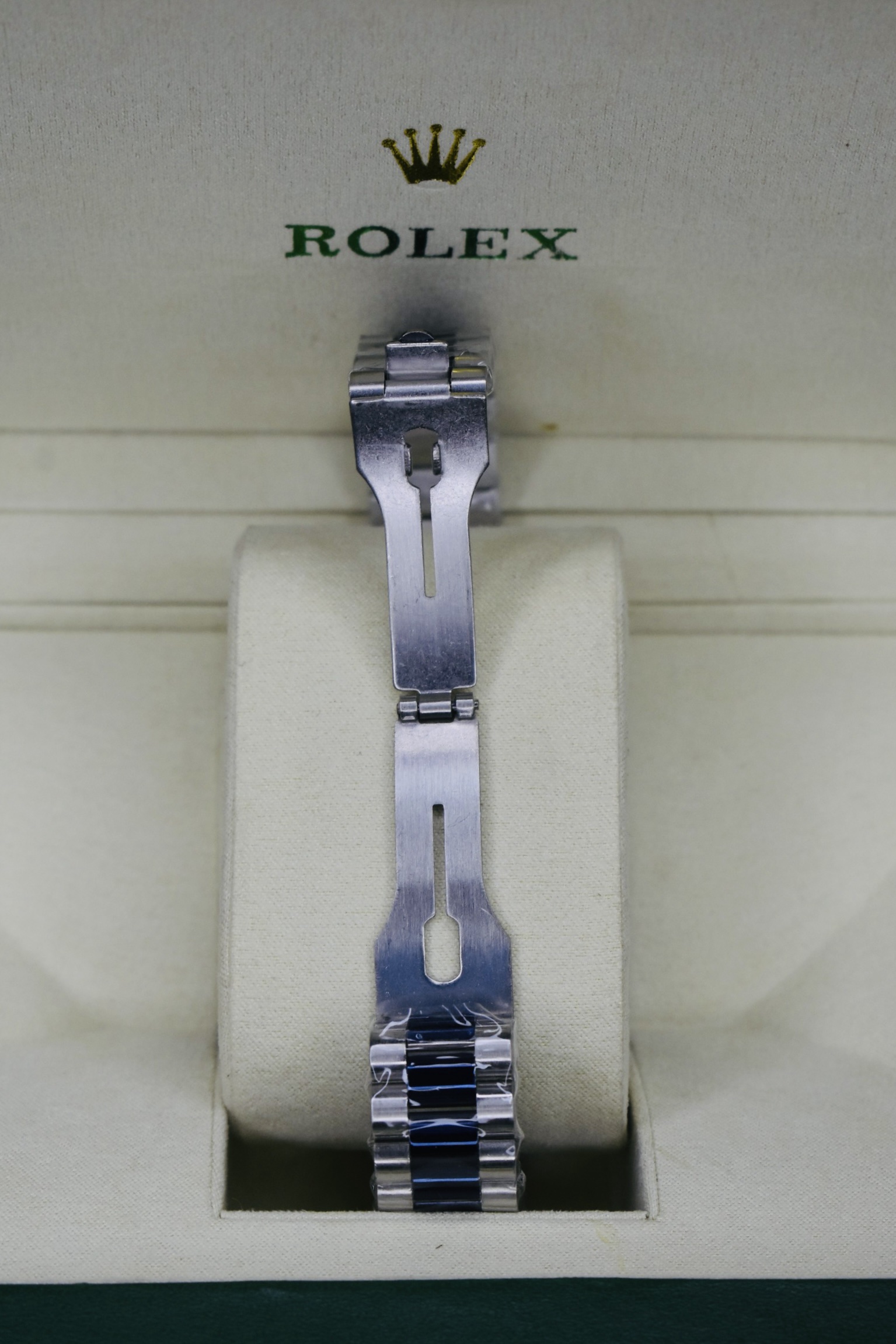 The Rolex Blueline features a striking Blue dial running through the center, perfectly complemented by dazzling diamond hour markers. Its design balances simplicity with luxury, making it a versatile accessory for any occasion.This watch stands out as a symbol of refined taste and classic sophistication.