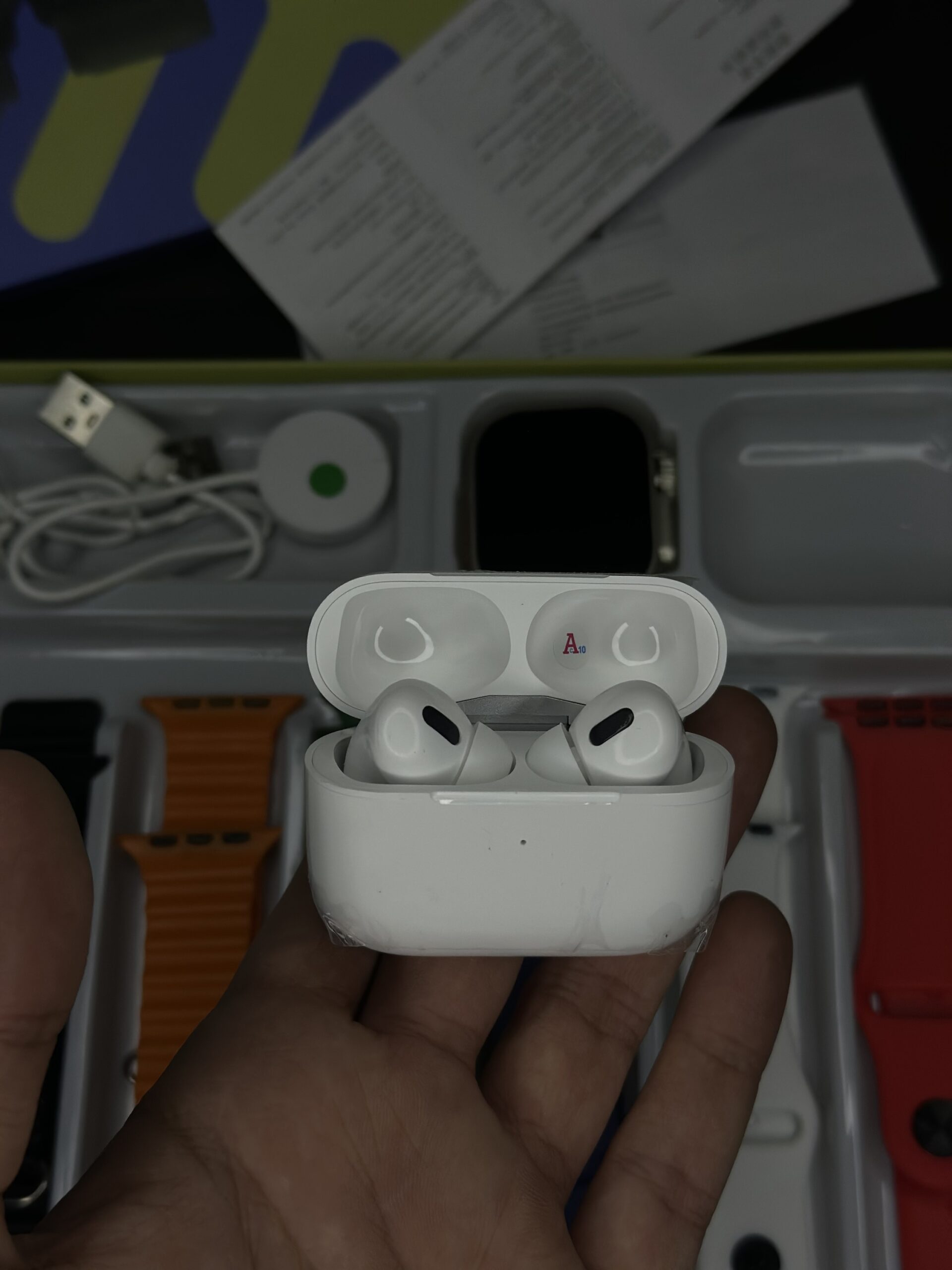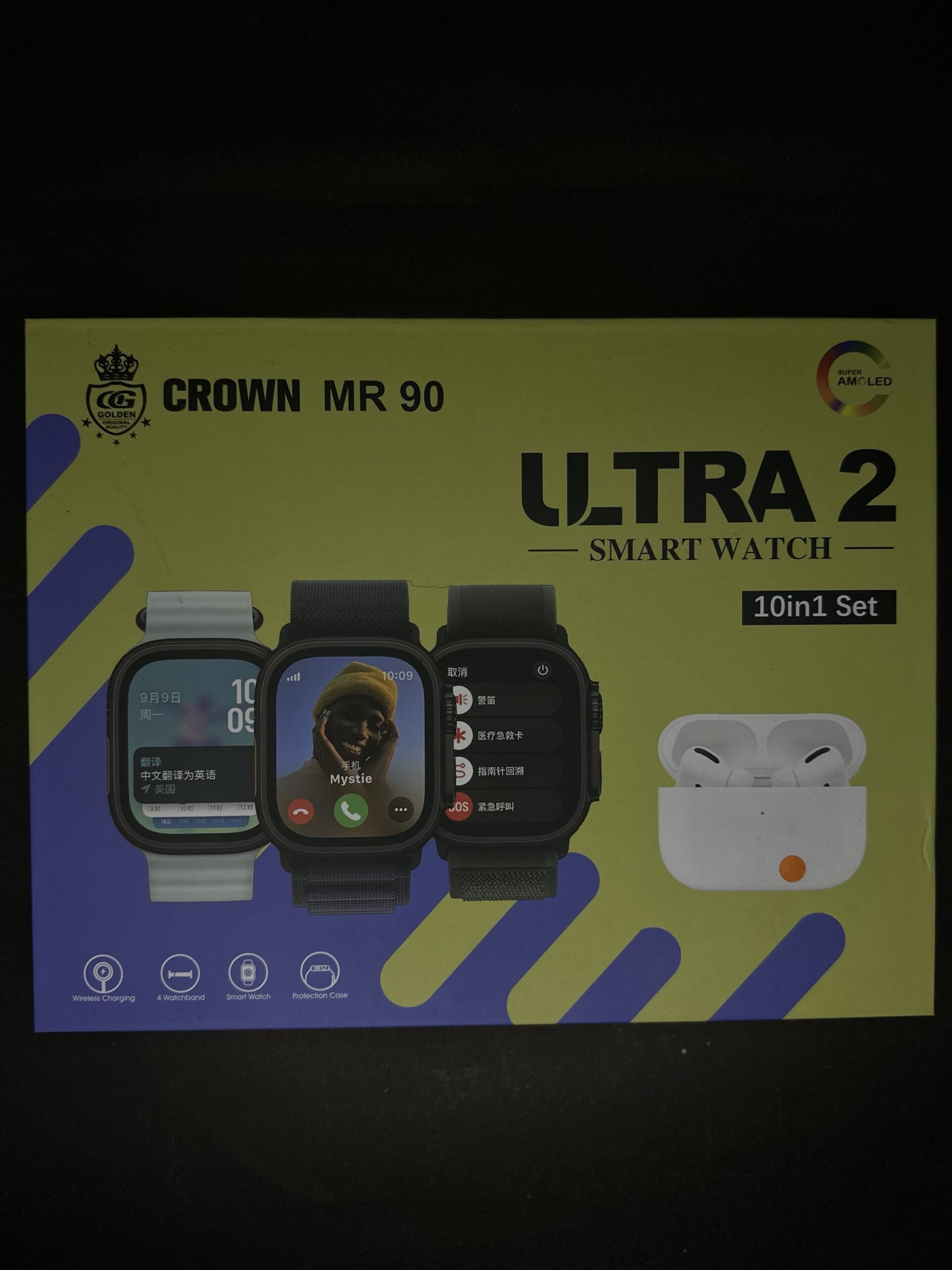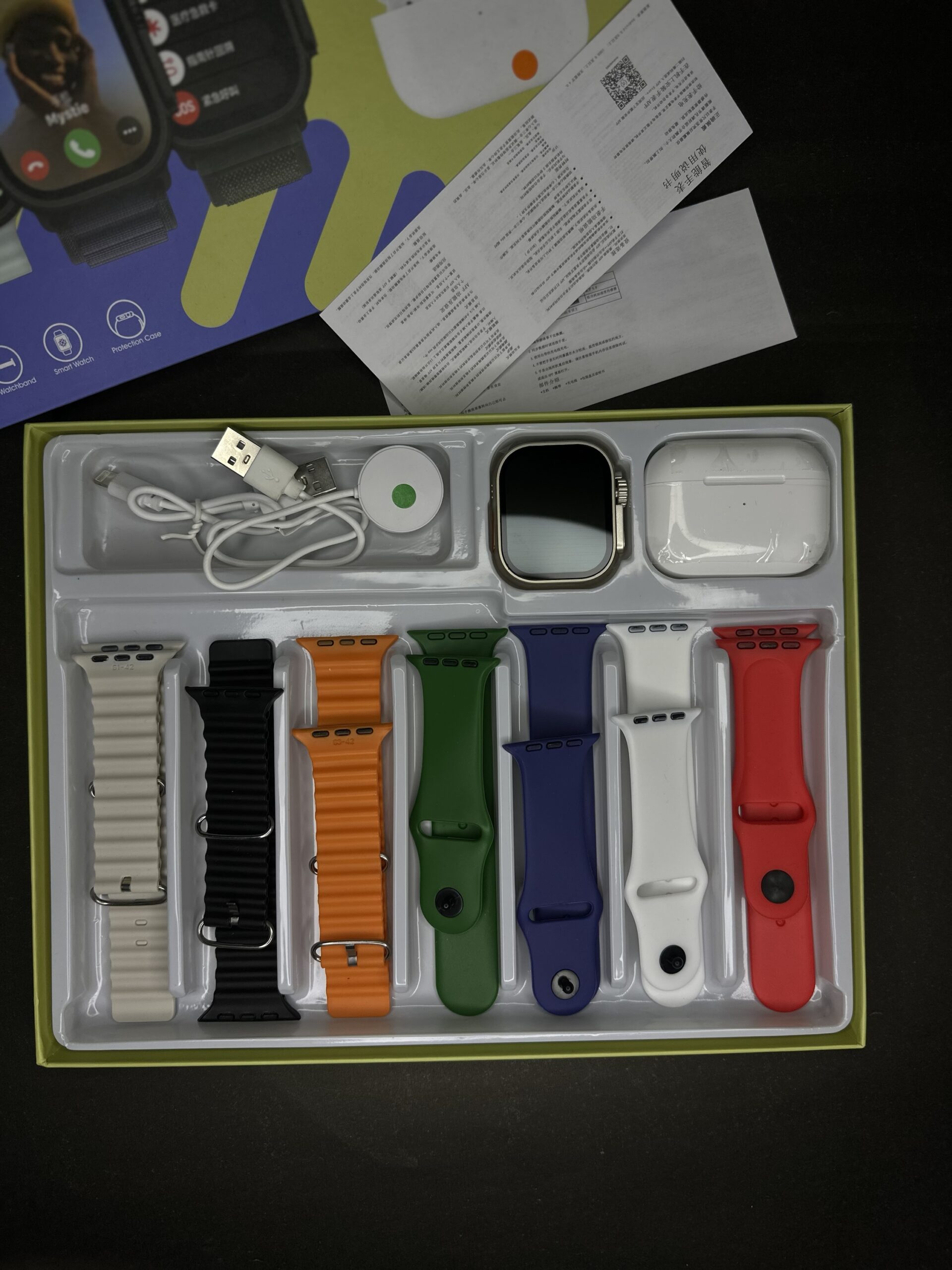 SMART WATCH ULTRA is a multi-function smartwatch bundle that comes with a premium watch, wireless charger, earbud case, and 7 interchangeable straps in different colors and styles. Designed for daily fitness, notifications, and style customization.