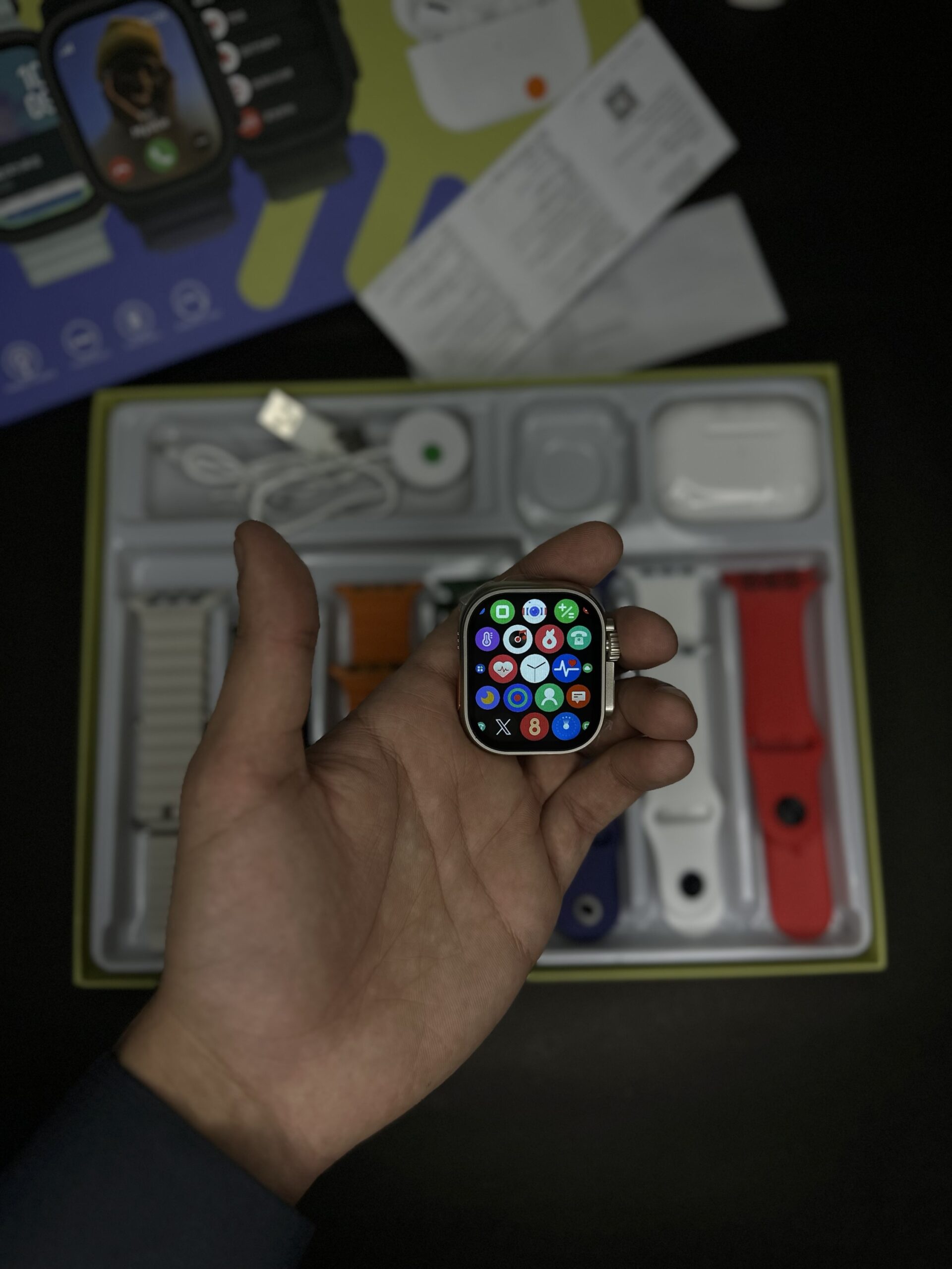 The SMART WATCH ULTRA is a complete smartwatch set designed for users who want style, performance, and versatility in one box. The watch features a large display with a metal-style frame, side crown, and health-tracking functions. It supports notifications, calls, fitness tracking, and more.